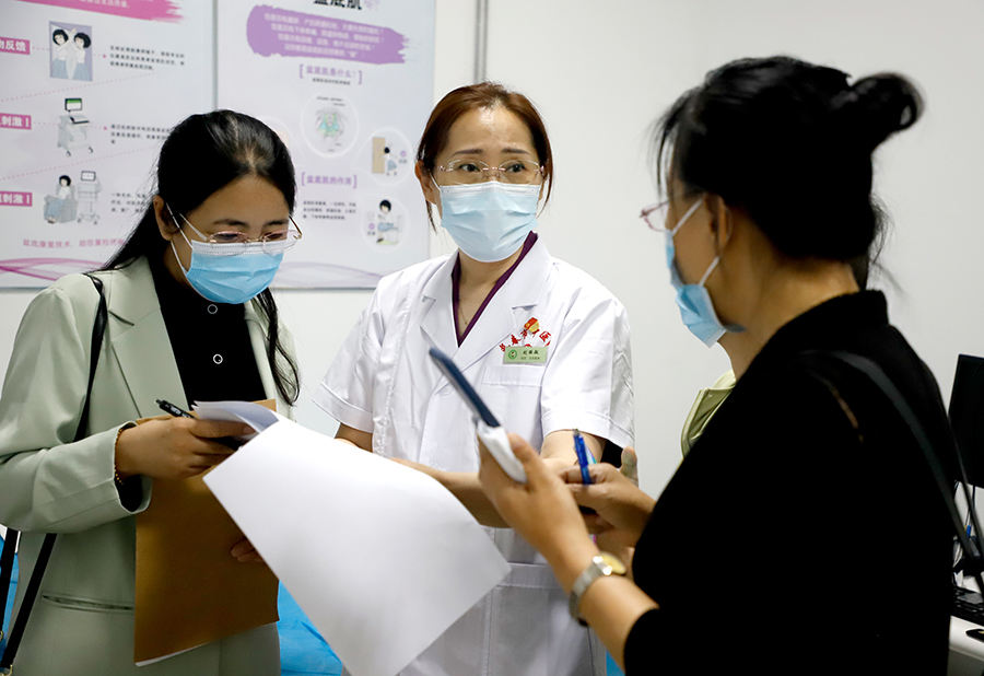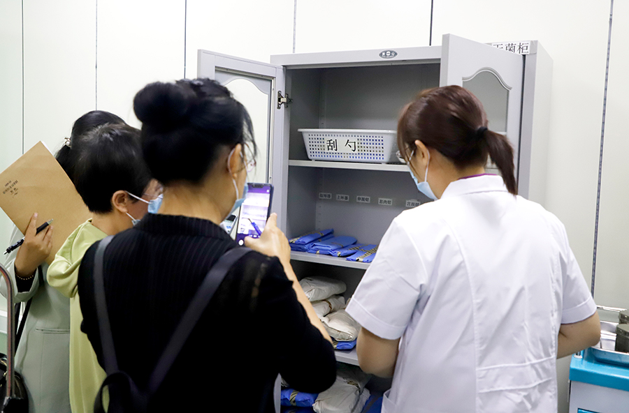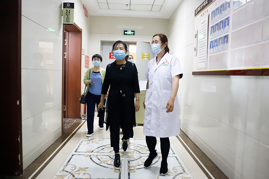 韩秀杰一行先后参观了总部妇科门诊、疗区,对医院妇科设置、医疗文件及中医领域开展的项目进行相关询问,尤其是对中医特色诊疗服务、急诊急救方面做了详细了解。在手术室和综合治疗室,刘丽敏对中医药治疗外阴白斑、盆腔炎、盆腔肿物等特色方法向韩秀杰一行进行了详细介绍,在疗区细致了解中医药透药、敷贴等中医诊疗技术,医护人员在现场进行了操作指导。另外,双方还就医联体规范化建设工作、远程医疗系统建设工作、派驻专家对基层进行对口支援工作、推动资源共享、医院环境消毒监测工作、强化合作与协同等进行了深入交流。