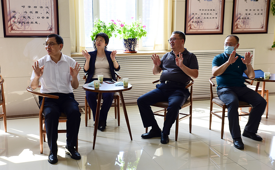 在孙良金院长的带领下,调研组一行先后来到消防控制室、煎药室、中药房、急诊科等地进行参观。在治未病中心,调研组共同学习手指操,了解中医“未病先防、欲病救萌、已病早治、既病防变、瘥后防复”的理念。在总部康复科疗区,通过视频的方式与平阳部、东部的医护人员进行交流。在实训中心,调研组对医院科学实用的教学模式给予高度评价。调研组每到一处,都会与医护人员一一交流,对于调研组提出的问题,孙良金院长也都一一解答。