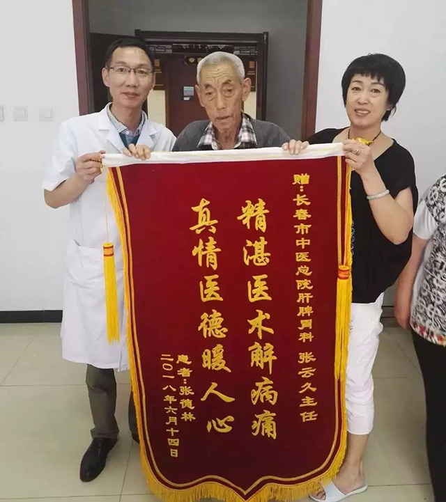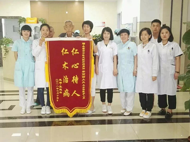 他醒来之后,说想在自己还清醒的时候,给医护人员送一面锦旗。6月14号那天上午打完针后,老人坐在轮椅上,手里拿着两面锦旗,被孙子和女儿推着来到医生办公室,一面锦旗送给了张云久主任,一面送给了其他所有的医护人员。当把锦旗献到医护人员手中时,老人激动得哭了。现场的医护人员也是眼含热泪。“当时我心里也很难——我多么希望我能治好老人的病,可我却无能为力。惟一能做到的,就是在老人最艰难最痛苦的时期,给他更多的温暖和关爱。”姜丽丽说。
