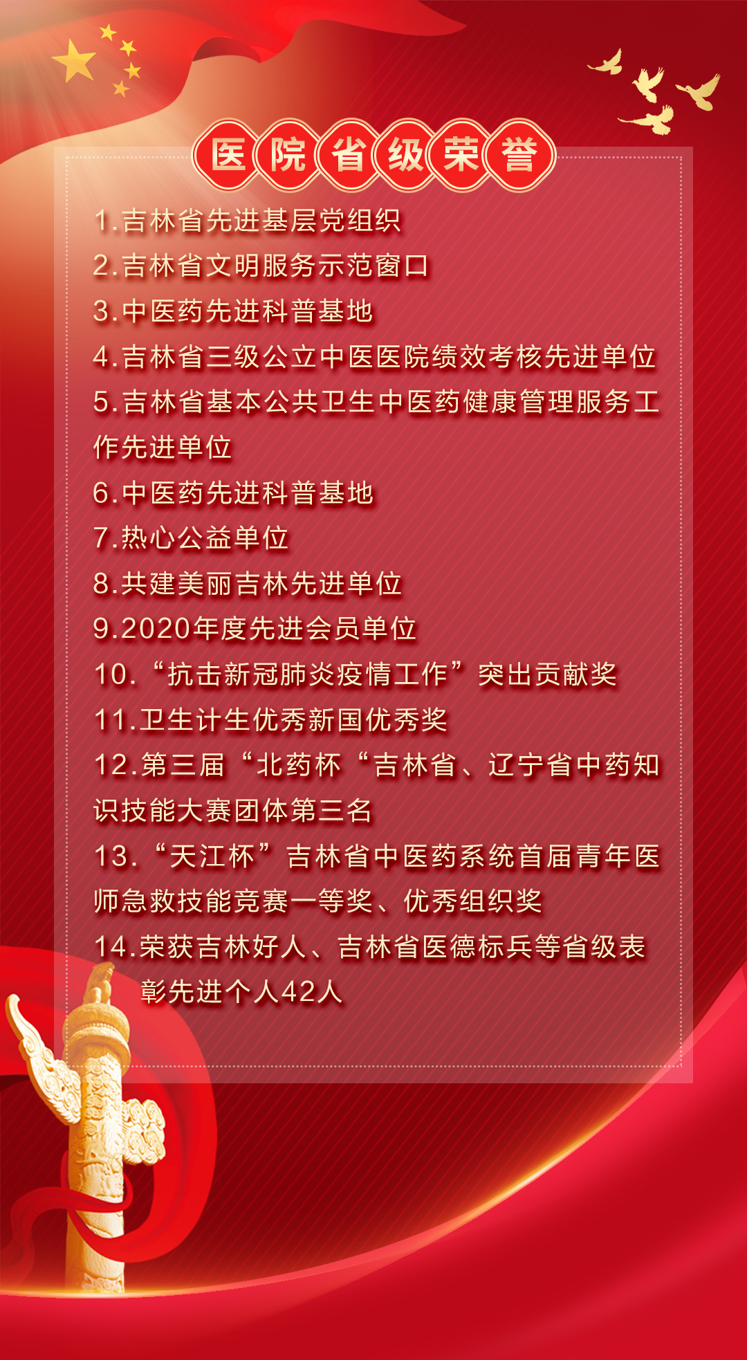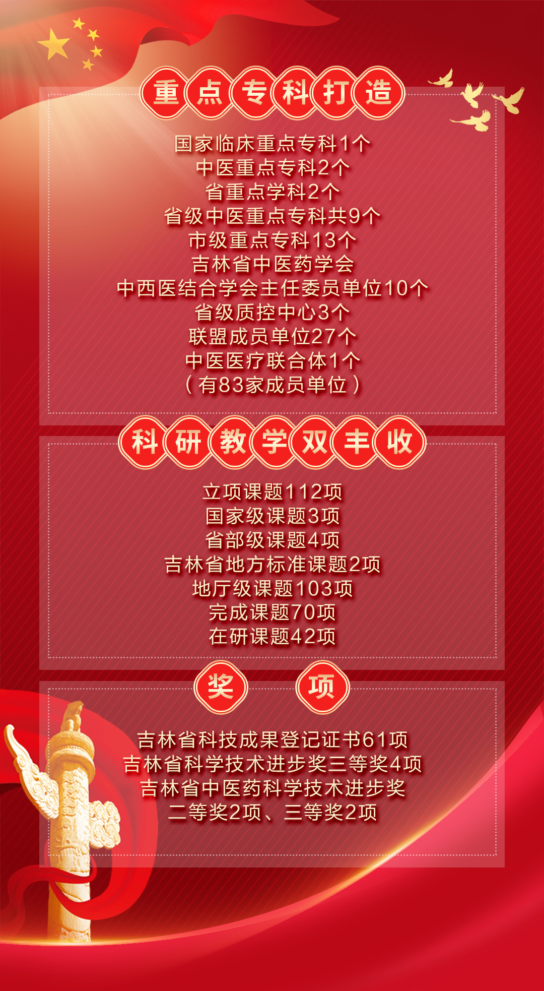 【献礼】喜迎国庆,中医人用成绩向祖国献礼 中医院 |2021-10-01 09:31 上一篇这项工作,获国家级通报表扬! 下一篇国庆我在岗 | 用坚守向祖国深情告白 返回列表 相关信息 国庆我在岗 | 用坚守向祖国深情告白 2021-10-01 国庆节,中医专家们不休息,走进住邦广场为春城百姓义诊! 2018-10-09 中医专家告诉你十一国庆节该这样过! 2018-09-30 中文成人网 组织职工观看电影《我和我的祖国》 2019-10-25 【喜报】中文成人网 在长春市卫健委团委举办的“争做卫健新青年 青春献礼新时代”演讲比赛中荣获3项殊荣 2023-05-05