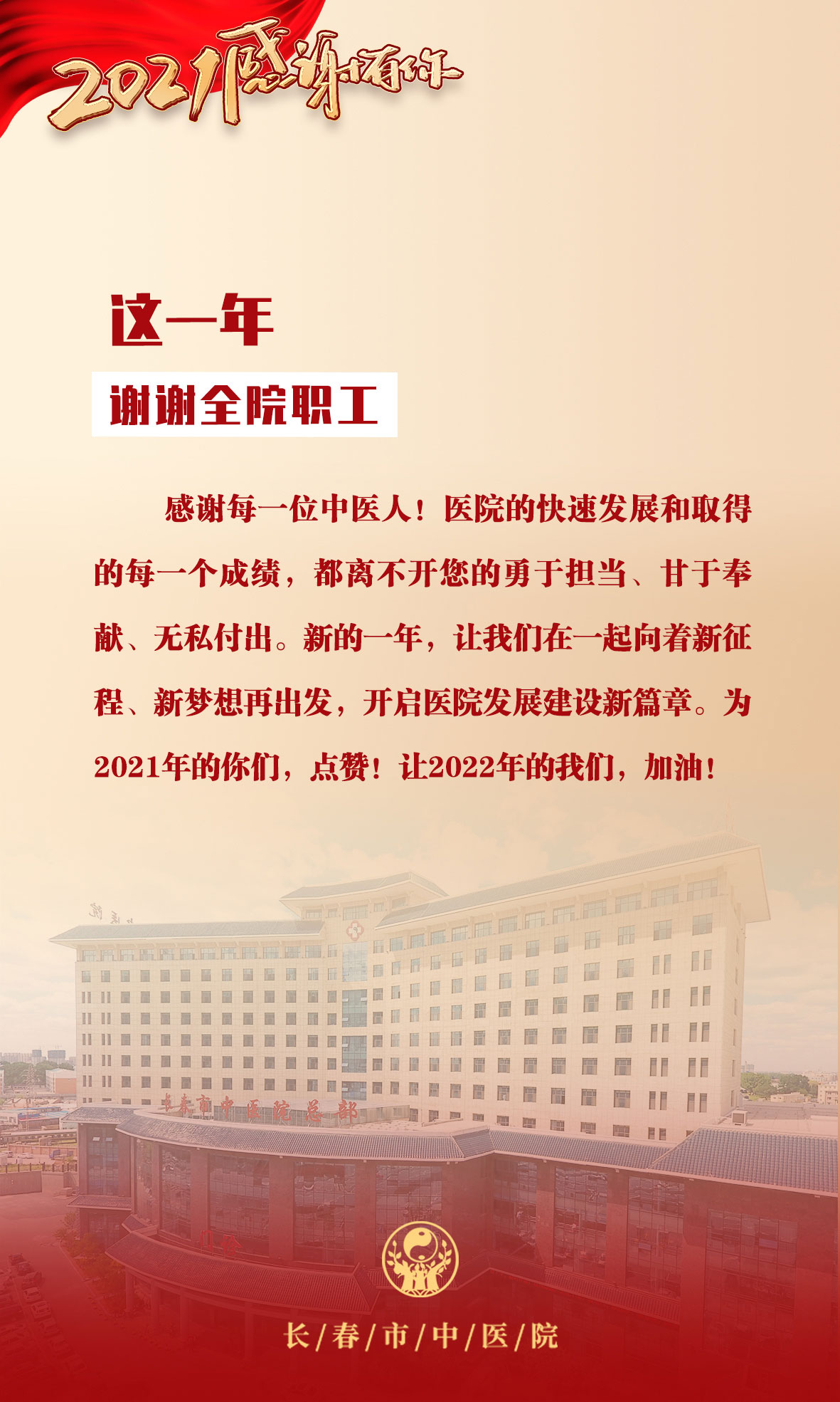 2021,感谢有你! 中医院 |2021-12-31 08:36 时光荏苒2021年即将过去这一年有难忘,有惊喜,有温暖,有感动年终岁尾我们想跟最亲爱的你说一声谢谢感谢有你,感谢相伴2022年让我们继续心存美好,无畏向前 上一篇这群药剂人,在平凡中坚守,在奉献中闪光 下一篇中文成人网 开展安全教育培训及元旦前安全生产检查 返回列表 相关信息 感谢有你,迎难而上 2022-04-01 感谢有你,勋章赠给最美白衣天使 2021-04-09 感谢有你,“疫”路护航!这场欢送会,专为抗疫车队举行 2022-05-25 白衣天使,愿你被这世界温柔以待 2018-05-12 赵继福获评“2021年全国文化科技卫生‘三下乡’活动服务标兵” 2022-03-03