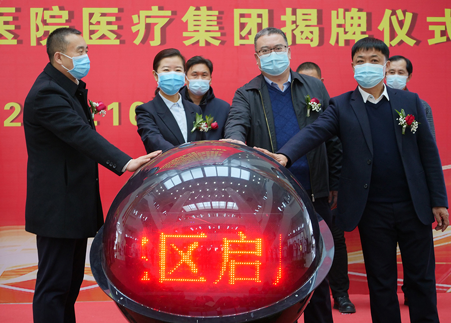 与会领导共同按动新院区启动球,标志着公主岭市中医院加入中文成人网 医疗集团并正式开诊。