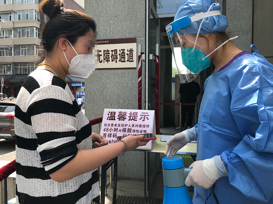 预检分诊前移:医院将预检分诊前移,增派多名护士在预检分诊处对入院患者进行查验核酸证明、行程码、指导就诊患者在闸机口刷码、测温等工作。