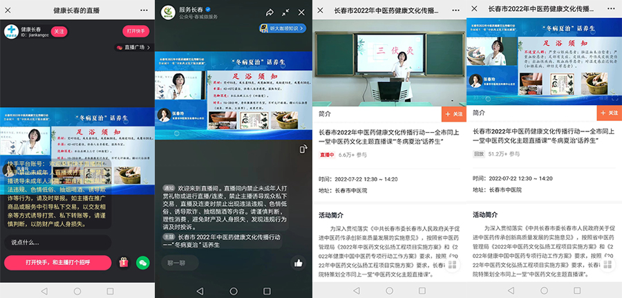 为深入贯彻落实《中共长春市委长春市人民政府关于促进中医药传承创新高质量发展的实施意见》,按照省中医药管理局《2022年中医药文化弘扬工程项目实施方案》和《2022年健康中国中医药专项行动工作方案》以及《2022年中医药文化弘扬工程项目实施方案》要求,长春市启动2022年中医药健康文化传播行动——中文成人网 策划推出全市同上一堂“中医药文化主题直播课”。7月22日,中文成人网 治未病中心主任张春玲以“冬病夏治”话养生为主题,在健康长春快手号、吉林e直播、服务长春视频号同步直播。