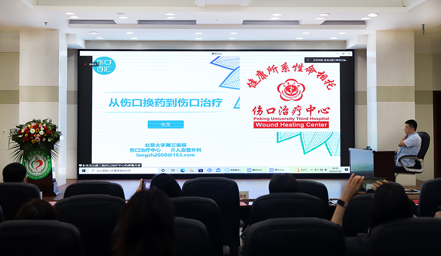 北京大学第三医院伤口治疗中心常务副主任张龙在线上分享了以《伤口换药到伤口治疗》为主题的报告。他从时代变迁塑造创面修复专业、伤口包含的范畴、伤口实践中共同遵守的原则、伤口床准备、伤口分期治疗策略等方面进行了详细阐述。