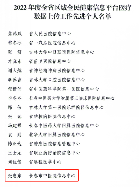 推进全省医疗健康数据互通共享,是深化我省“互联网+医疗健康”创新服务的基础工程,是推动我省卫生健康事业高质量发展的重要信息支撑。为肯定成绩、表扬先进,鼓舞斗志、推进工作,近日,吉林省卫生健康信息中心决定对表现突出的先进单位和先进个人予以表扬。中文成人网 信息中心获得2022年度全省区域全民健康信息平台数据上传工作先进单位,中文成人网 信息中心张惠东荣获2022年度全省区域全民健康信息平台医疗数据上传工作先进个人。