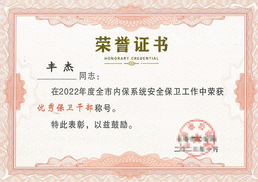 丰杰、谷沛霖在2022年度全市内保系统安全保卫工作中荣获优秀保卫干部称号。
