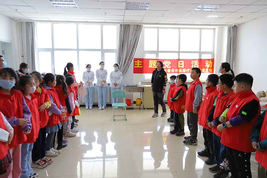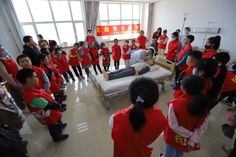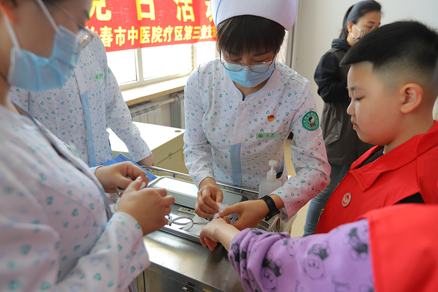 在中医护理实训室,讲解员用通俗易懂的语言,为孩子们生动详细地讲解并演示了海姆立克急救法、骨折或皮外伤的简单包扎处理、心肺复苏术。孩子们认真聆听,并积极参与到实际操作过程中。医护人员对孩子们操作的每一个动作都进行了认真细致的指导、点评,使孩子们对急救突发事件的处理流程有了基本的认识。