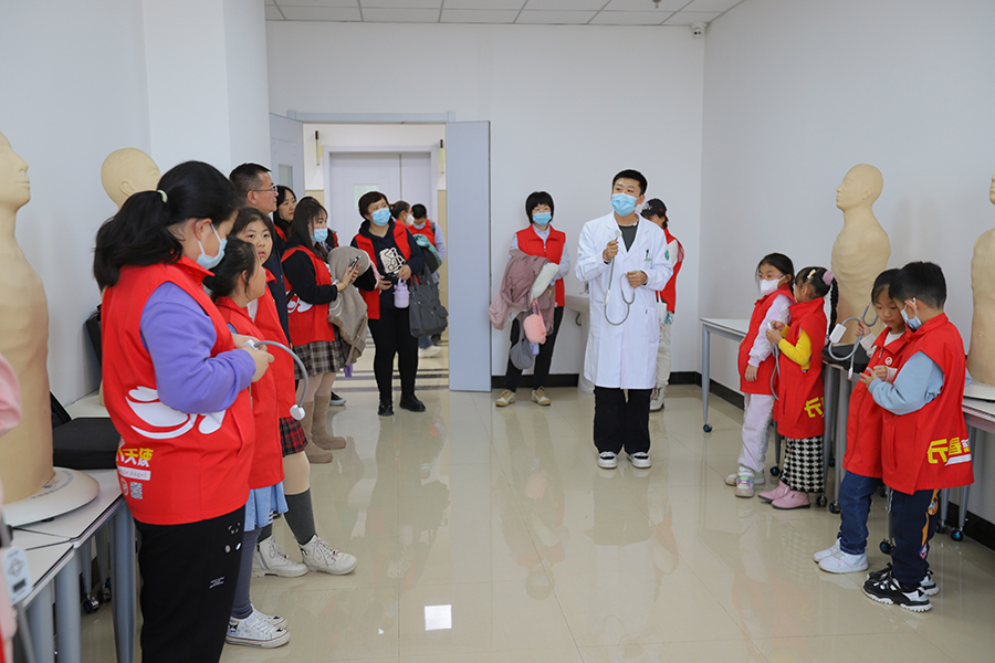 随后,孩子们在讲解员的带领下,来到了中医针推实训室,了解了神秘的人体经络、学习了简单的中医治病防病理念,见识了中医传统的针灸、诊脉等项目。在心肺听诊实训室,讲解员教每位同学使用听诊器听心音和肺音,教大家摸脉搏、数脉搏,让大家了解人体脉搏的正常值。