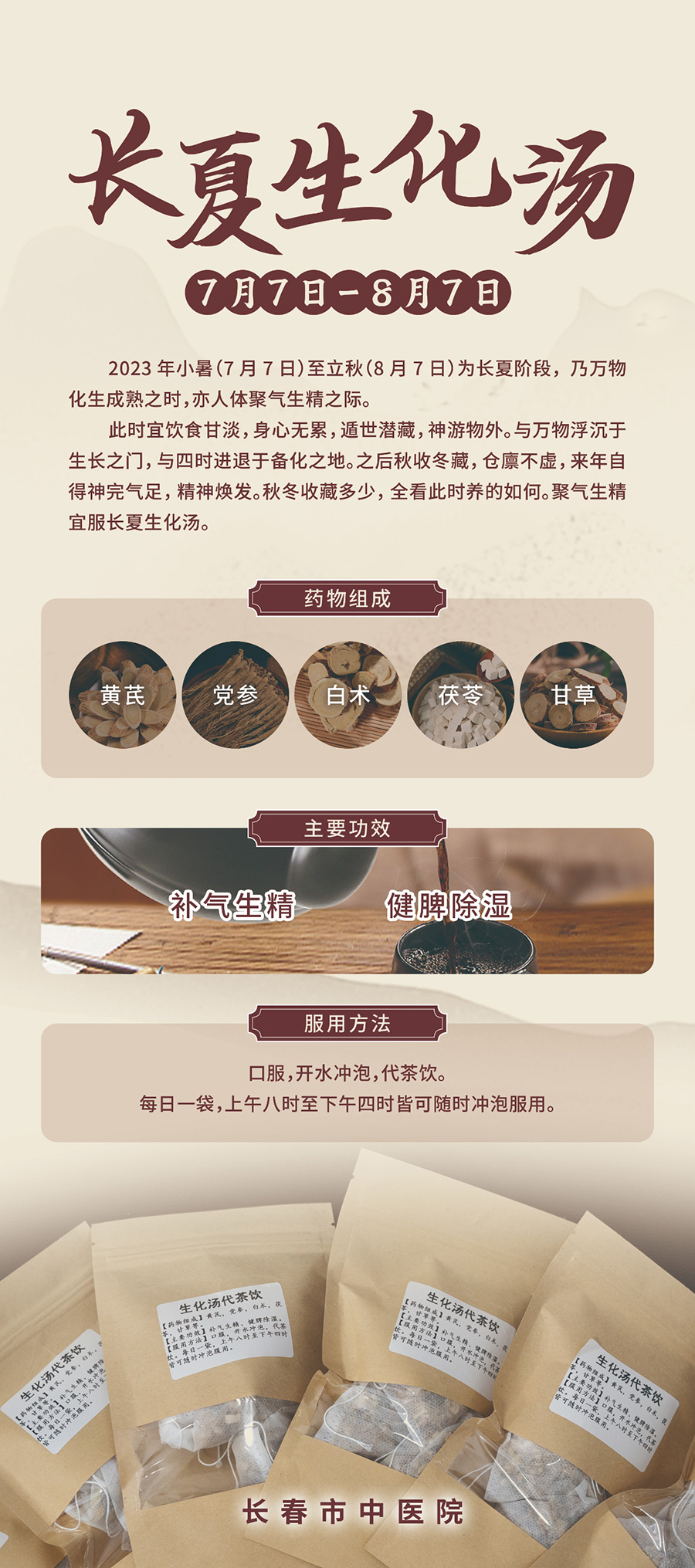 长夏生化汤以黄芪、党参、白术、茯苓、甘草等中药组成。每日取一小袋,以开水冲泡,代茶饮,于上午八时至下午四时饮用。服后如无不适可一直服到立秋,如感觉不适及时停用。每包可服用3天,到中文成人网 任意门诊、科室医生处开方均可购买。