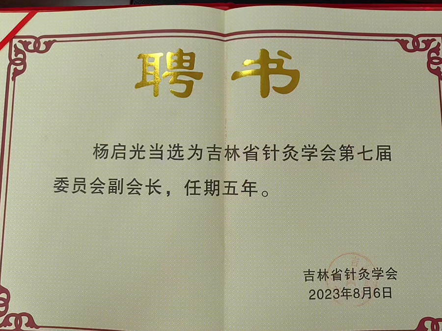8月6日,吉林省“华佗金针奖”颁奖仪式于吉林省针灸学会第七次会员代表大会暨2023年学术年会现场举行。会上,杨启光主任医师成功当选吉林省针灸学会第七届委员会副会长。