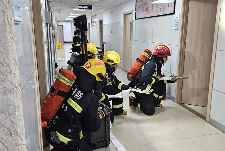 演练现场,疗区责任人员带领患者、家属及医护人员捂住口鼻、压低身体,迅速撤离到指定安全区域。同时,面对瞬息万变的火情,医院微型消防站第一时间响应,人员、设备迅速就位,全力压制火势蔓延,为消防员的到来赢得宝贵时间。随着消防员的到来,疗区的火被扑灭,火警解除。