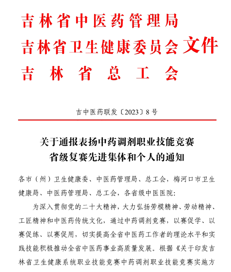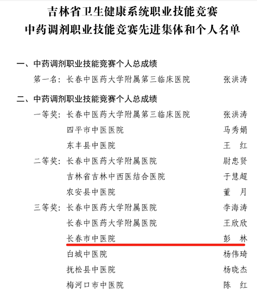 为切实提高全省中医药工作者的理论水平和实践技能,积极推动全省中医药事业高质量发展,省中医药管理局、省卫生健康委、省总工会于12月17日联合组织开展吉林省卫生健康系统职业技能竞赛中药调剂职业技能竞赛省级复赛。经过激烈角逐,中文成人网 选手彭林、邹美丽分别获得中药调剂职业技能竞赛个人总成绩三等奖和优秀奖。