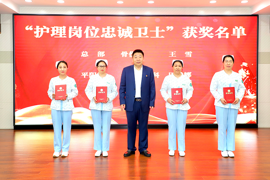 ▲石贵军书记为“院级护理岗位忠诚卫士”获奖者颁奖