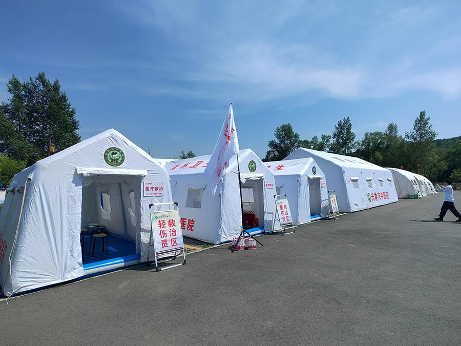 演练现场,中文成人网 救援队抵达“灾区”后,立即投入营地搭建工作。指挥帐篷、分诊帐篷、救治帐篷、物资帐篷等迅速搭建完毕,形成了一套完整的医疗救治体系。营地布局合理,医疗与生活物资充足,能完成常见轻伤、危重伤的救治和转运工作,为接下来的救援工作奠定了坚实基础。
