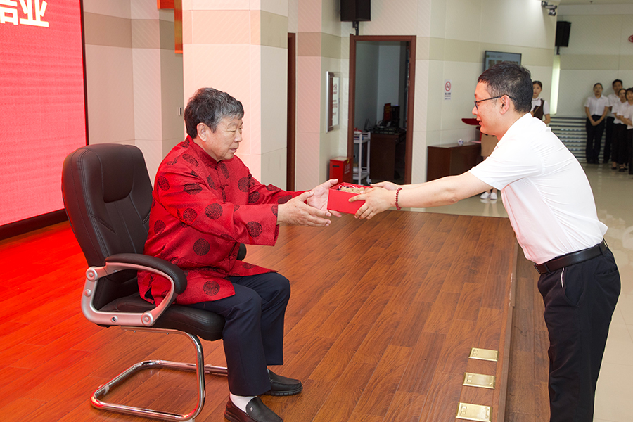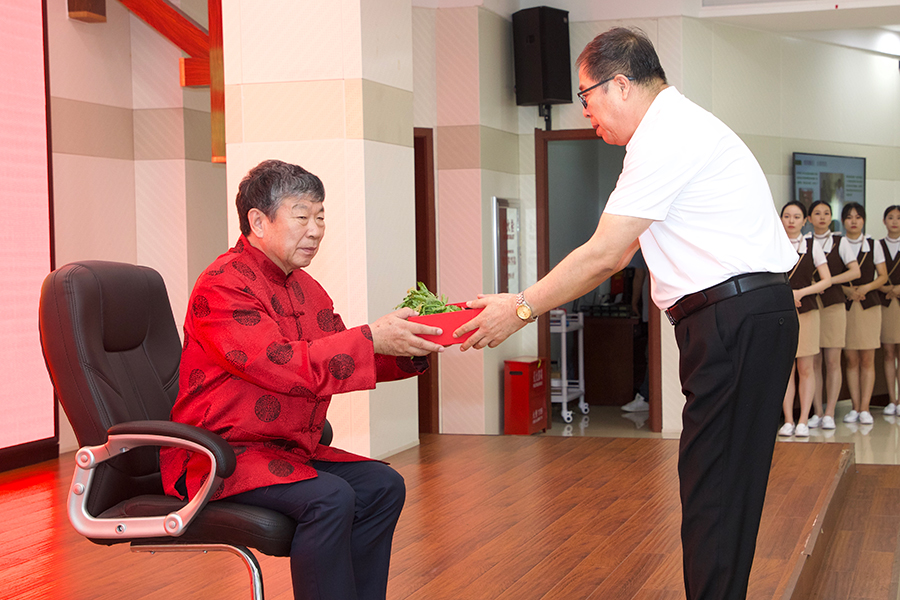 仪式上,学员们依次上前,双手恭敬地呈递上拜师帖,与赵继福教授签定协议,建立师徒关系,并敬上香茶。送“六礼”是中医传统中徒弟向师父表达诚挚敬意的重要环节,学员们现场为赵继福教授送上“六礼”和鲜花,并行拜师礼。