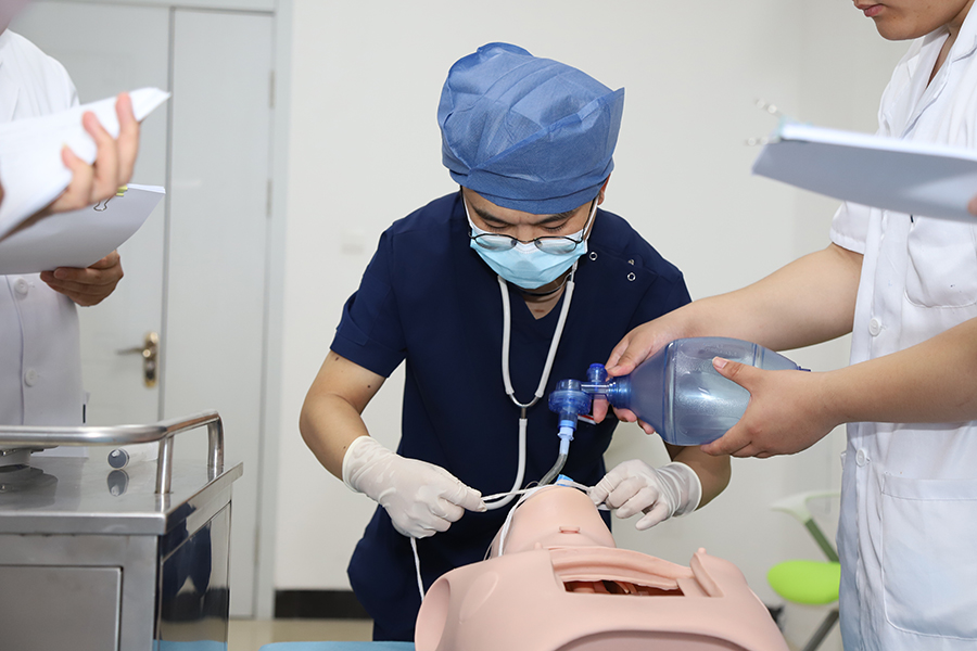 在气管插管环节,医师们紧绷着神经,小心翼翼地定位喉镜,精准插入气管导管,确保模拟患者能够正常通气。整个过程大家沉着冷静、动作娴熟,每一个步骤都保证了精准无误。