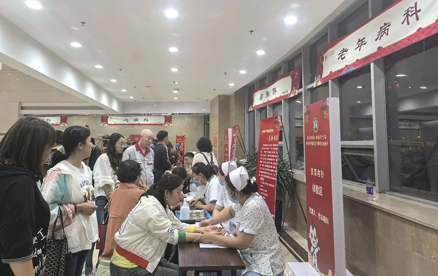 在一楼中医药文化体验区,各式各样的活动让人目不暇接。市民们不仅可以品尝到由五行理论精心制作的糕点,感受美味与养生的完美结合;还能亲手制作中医香囊,精选的中草药散发出阵阵香气,既美观又富有寓意。此外,代茶饮、院内制剂、特色足浴等体验项目也备受青睐,大家纷纷排队体验,感受中医药文化的独特魅力。