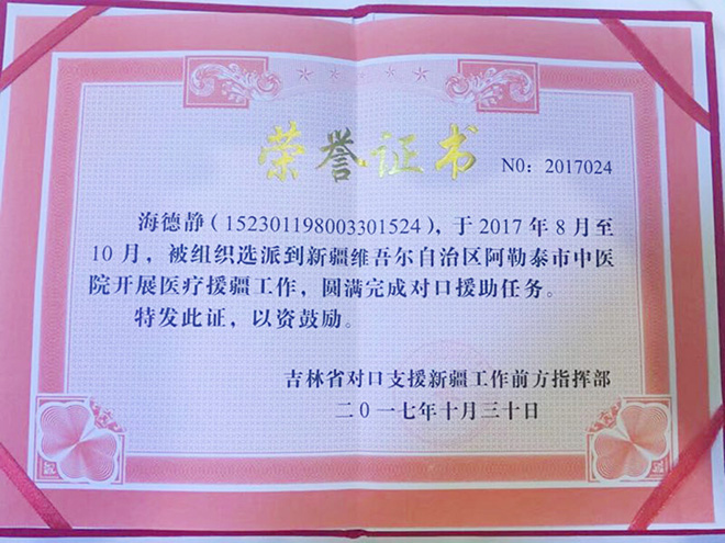 2017年8月份,海德静曾跟随省里组织的40名医疗工作者的援疆队伍,在阿勒泰市医院工作半年。而今年5月,她把年仅5岁的女儿扔给了父母,再一次踏上了援疆之路。这一次她援助的单位,是阿勒泰市人民医院。海德静的专业是康复理疗,她拥有丰富的临床经验。对接工作后,她主要开展骨关节疾病、脑梗塞后遗症的康复理疗,重点培养一名医生熟悉和掌握针对该类疾病的基本治疗手法。对于不能来院就诊的患者,她亲自入户指导患者如何进行康复治疗。针对中医科负责脑瘫患儿的康复工作,海德静医生援疆后指导采购康复器材,培训康复医生,使小儿脑瘫的康复工作进入新阶段。