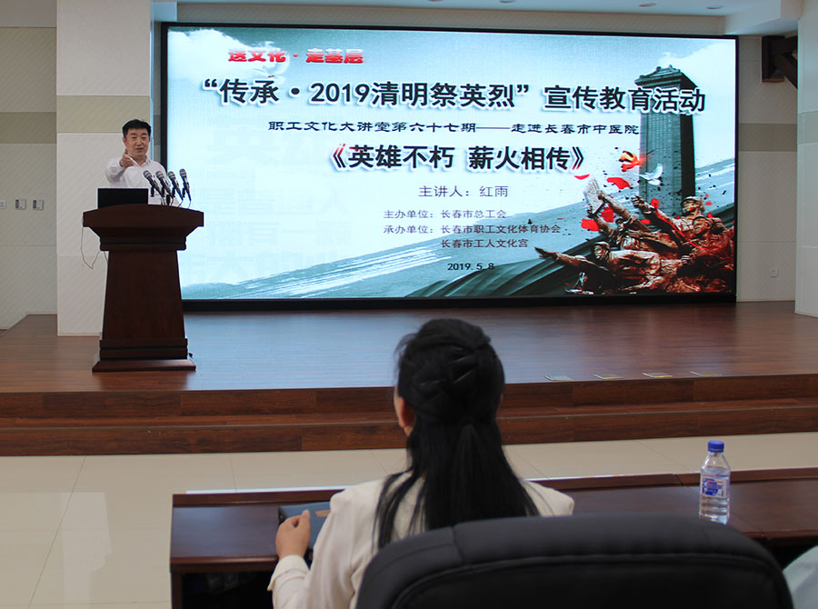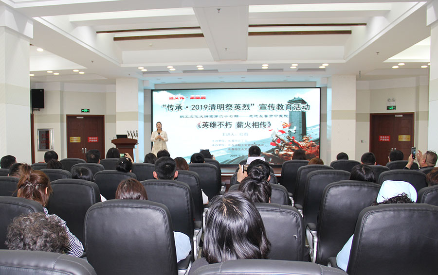 今年是新中国成立70周年,为全面贯彻《中华人民共和国英雄烈士保护法》,缅怀先烈、传承英烈精神,5月8日,中文成人网 党委、工会联合长春市总工会组织开展以“传承·2019清明祭英烈”为主题的职工文化大讲堂专题讲座活动,本次活动特邀请吉林人民广播电台资深主持人红雨老师为大家授课,医院全体党员干部、分会会员100余人参加了活动。