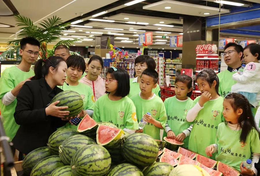 体验大巴一路欢歌笑语,很快来到第一站欧亚超市万豪店。8点30分,超市里新鲜的果蔬早已整齐地摆在货架上,柿子、豆角、黄瓜、荔枝、西瓜,个个鲜嫩欲滴。首先,超市的工作人员向大家讲解了果蔬的进货地点,如何查验进货渠道,以及当天剩余果蔬如何处理等食品安全问题,并教大家如何挑到新鲜、安全、好吃的果蔬。