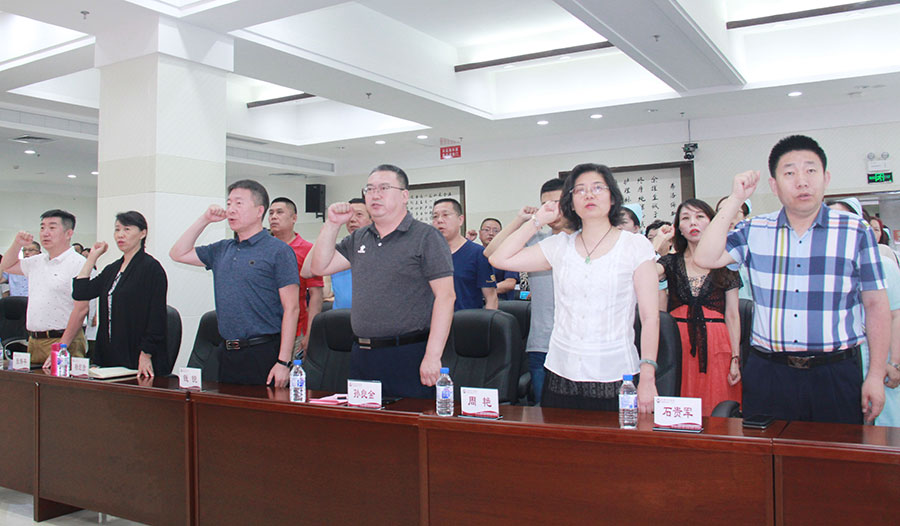 在活动开始之前,全体同志起立,面对鲜红的党旗,庄重举起右手,在毕海波同志的带领下,重温入党誓词。