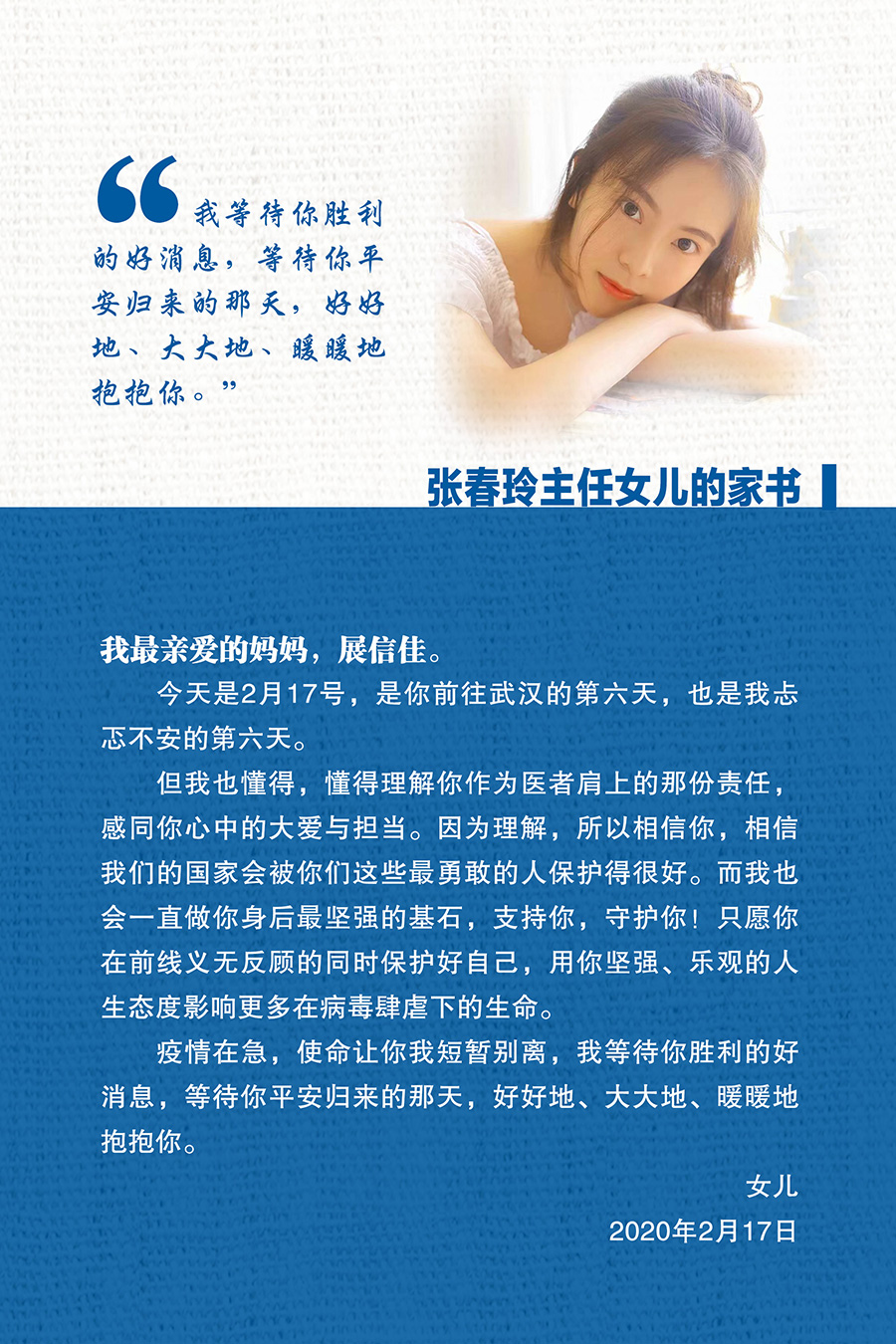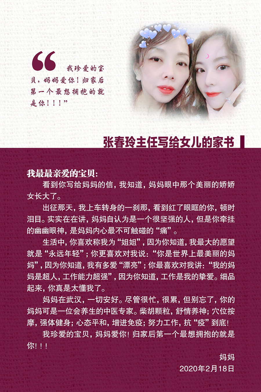 战“疫”一线传回来这样一封家书 中医院 |2020-03-04 09:25 上一篇市中医救治新冠肺炎患者专家组组长、中文成人网 副院长接受省内4家媒体专访 下一篇来自长春的音频在武汉病房中响起…… 返回列表 相关信息 党旗所向,白衣为袍,“硬核”院长始终坚守战“疫”一线 2020-03-26 坚守抗疫一线,来自中医人的“医”无反顾 2022-04-25 向端午节坚守在抗疫一线的英雄们致敬 2022-06-03 抗疫一线,她永葆共产党人政治本色 2022-05-21 抗疫一线,她永葆共产党人政治本色 2022-05-21