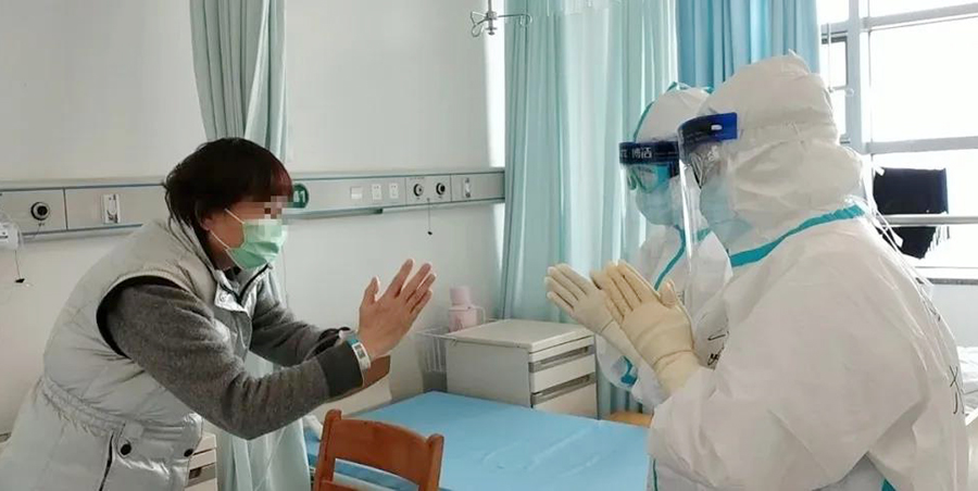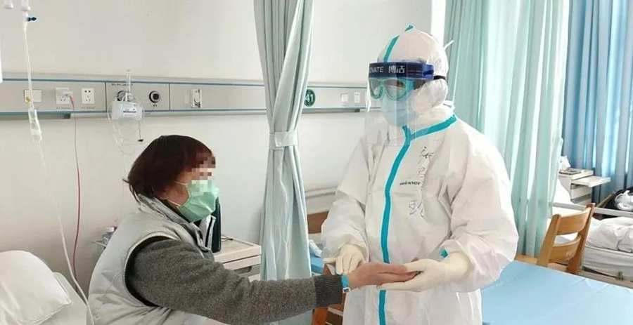 经过中西医结合治疗,患者连续两次的核酸检测均为阴性,入院时肺部CT显示的实变影及多发磨玻璃样影,得以吸收消散,微存的少量病灶,亦显著变淡,待慢慢吸收即可。患者出院在即,先前的忧容代之以笑意,且笃信中医,表示出院后要继续带些中药巩固疗效。我们辛勤的付出得到了患者的高度认可,万阿姨以最高的“礼赞”深谢,最美的瞬间在精彩的照片上留下永久记忆的烙印……