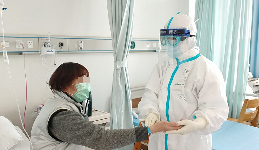 时间过得可真快,我们到雷神山医院已经一个月了,从紧张到从容,我已经适应所有的工作流程,慢慢地走上了正轨。我们所处的C8疗区是中西医结合治疗,对于我来讲,要特别关注患者的病情变化,认真地做好患者的心理护理,给他们树立战胜疾病的信心,积极配合医生治疗,还要让患者有良好的休息睡眠,加强卫生的健康宣教等等。开始有点不习惯,护眼罩勒得我头疼有时候还会恶心,头发及衣服已被汗水浸到湿透,但是当看着患者康复出院,看到我帮助患者完成一项处置,他们会说谢谢你,你辛苦了,这样暖心的话语时,让我所有的泪水,疲倦和艰辛都烟消云散了。武汉加油!中国加油!