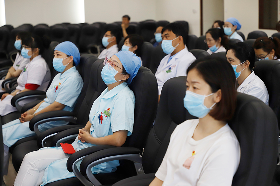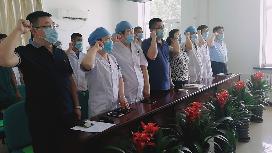 201名党员分布在医院总部主会场,医院平阳部和东部分会场。虽不在一起,但祝福同在。起立,同唱国歌。一份庄严,一份肃穆,唱出我们对祖国的赤诚之爱。