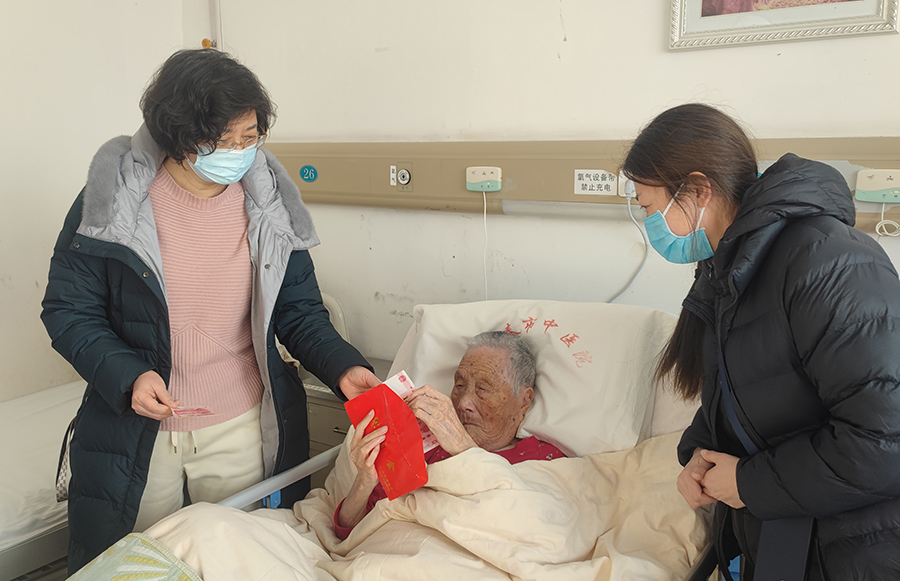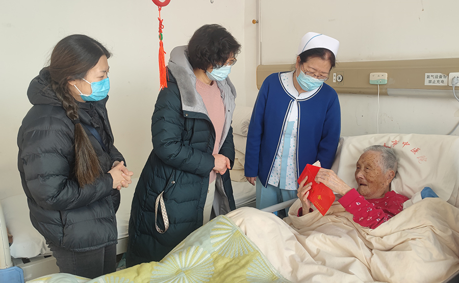 为切实把党中央、省委关于离退休工作的各项方针政策落到实处,按照长春市委老干部局、长春市卫健委部署和要求,在2022年新春佳节即将到来之际,1月27日上午,中文成人网 党委副书记周艳和离退休党支部书记郭婷走访慰问了98岁高龄的离休抗战老党员杨华。周艳说:“我们代表全院职工来看望您,给您拜年了!祝您新年快乐、身体健康!”慰问中,周艳还耐心倾听杨老的心声,并详细询问其身体状况,询问生活上有没有困难需要解决等问题,并送上了新春慰问金。