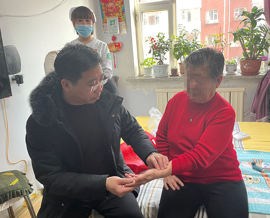慰问组一行人带着米、面、油等生活必需品来到了宫大娘家,同时,还特意带去了春联和福字,对她及其家人致以春节的问候。宫大娘见到慰问组人员的到来满心欢喜,她激动地说:“我的父母去世早,我和兄妹5人是在党的关怀和培养下长大的。”宫大娘非常感恩党的福祉,现在她的四个儿女也都是共产党员。在交谈中慰问组人员不难发现,宫大娘是发自内心对党有着深厚的感情,那种对党的爱戴与尊敬让在场所有人都感动。慰问组人员得知宫大娘前不久摔伤过。这让原本就有高血压、肺气肿和心脏病的她病情更加严重,稍有活动,就喘促不已,每月医药费就要两千多。跟随慰问的总部老年病科主治医师陈金东现场为她测量血压、听心率、把脉、开中药,并嘱咐她日常口服用药的一些注意事项。宫大娘认真地听着,不停地询问自己的病情,并希望自己的身体快点好起来,表示还要继续为党和社区做贡献。