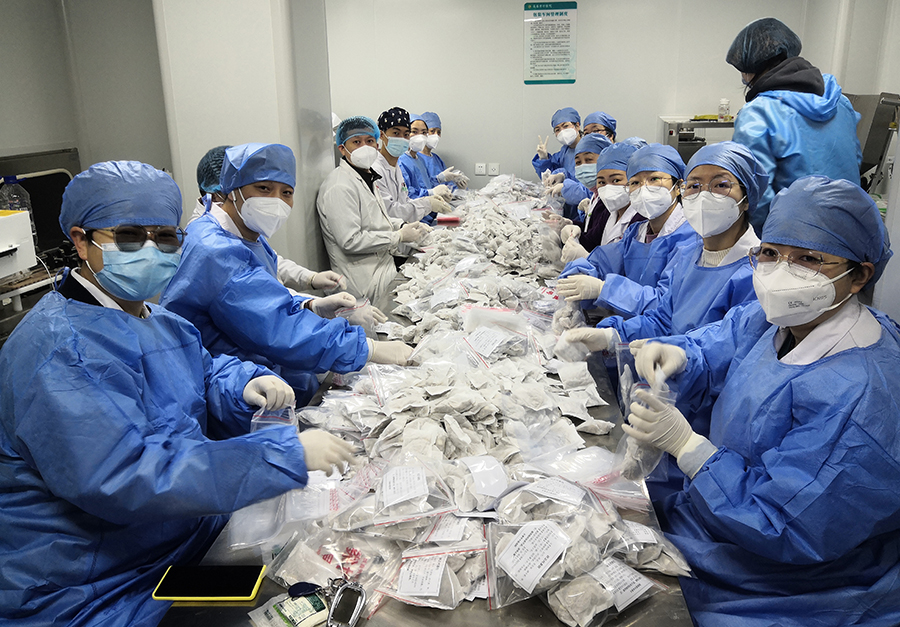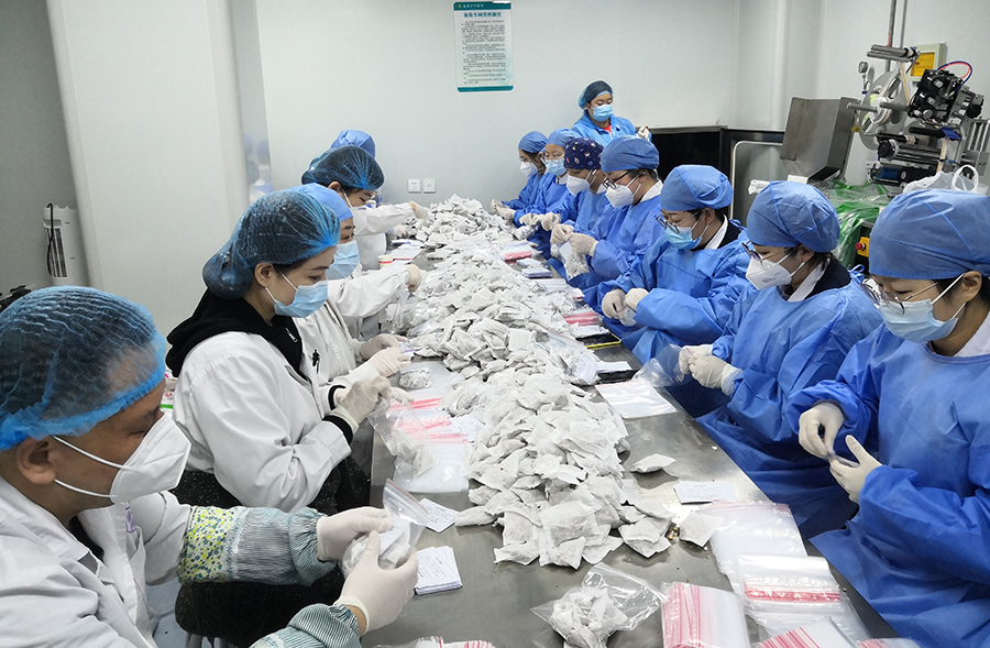 总部收款处王微在休息日也来到制剂室帮忙;由于公共交通停运,有的同志踏雪走了100分钟的路赶往医院支援制剂室。众人拾柴火焰高,在每天近三十人的支援下,眼看着一袋袋的扶正代茶饮被分装、运走。大家挑灯夜战,没有说笑声,只听到袋子摩擦的“沙沙”声。