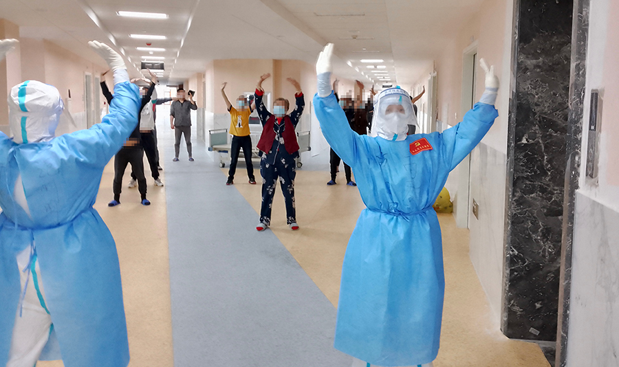 在通源方舱医院,患者人数众多,不幸被感染的阴霾在他们内心不断弥漫着。为安抚患者情绪,高群在工作之余,带领患者做八段锦,告诉他们只要积极配合治疗,锻炼身体,增强自身免疫力,以积极乐观的心态面对疾病,就一定可以战胜疾病,尽早康复出院。在驻地,高群既是临时党支部的支部书记,也是是医疗队的副队长。她承担起40名队员的后勤保障工作,每一次接到院里送来物资时她都会及时通知大家领取,驻地的早、晚餐分发及走廊消杀工作也是她与几名同事共同承担。她践行着全心全意为人民服务的宗旨,关心每一名队员。听到队员有特殊情况出现时,她都会立刻询问,给予帮助。她的话语和行动,就像一道阳光,照亮了前行的道路,驱散了患者和同事心头上的恐惧和焦躁,温暖了所有人。