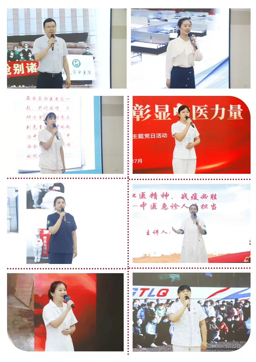 12个铿锵的声音,12个温暖的故事,是每一位“抗疫战士”负重奏响的凯歌,更是中医人初心如磐、传承红医精神的一份决心。为弘扬红医精神、突出榜样力量,7月6日13时30分,在中文成人网 总部4楼会议室内,由院党委组织召开的“传承抗疫精神 彰显中医力量”——“战疫中的你和我”故事会如期举行。12名来自8个党支部的选手,动情讲述战疫一线亲历者的医者大爱,用实际行动庆祝中国共产党成立101周年。