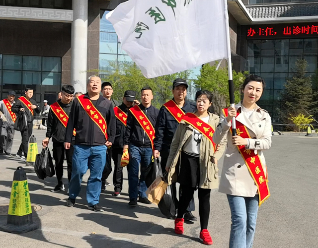 志愿者们佩戴着授带、打着院旗,步行奔赴瀚泽堂养老康复中心,整齐的队伍使得路旁市民齐声称赞:“中医院的志愿服务做得真好!”