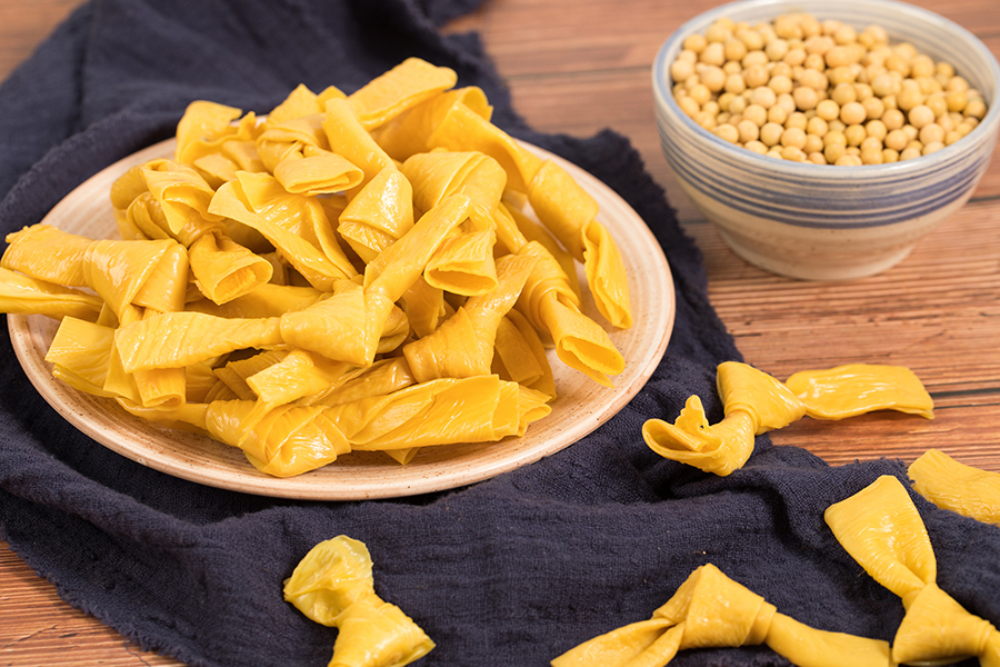 【原料】豆皮二张,葱、植物油、食盐、味精适量。