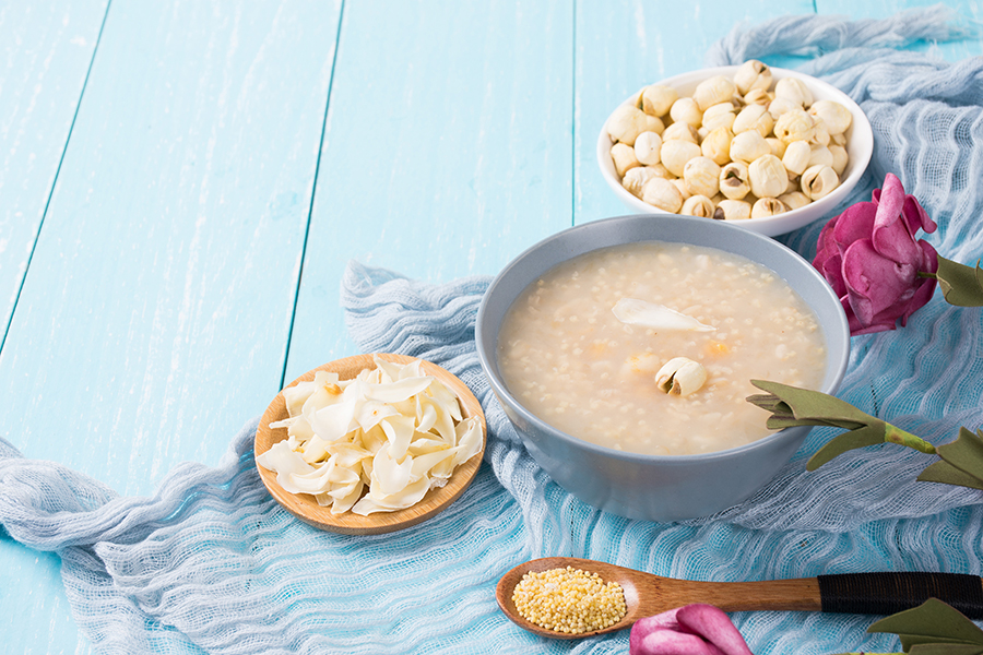 【做法】百合干用刀背碾成粉状,莲子用热水泡软,枸杞用热水稍泡,大米淘洗干净用冷水浸泡半小时。锅中放水,先放入大米、百合干烧开后,再放入莲子、枸杞,改用中火继续熬煮至熟,最后放入冰糖即可。