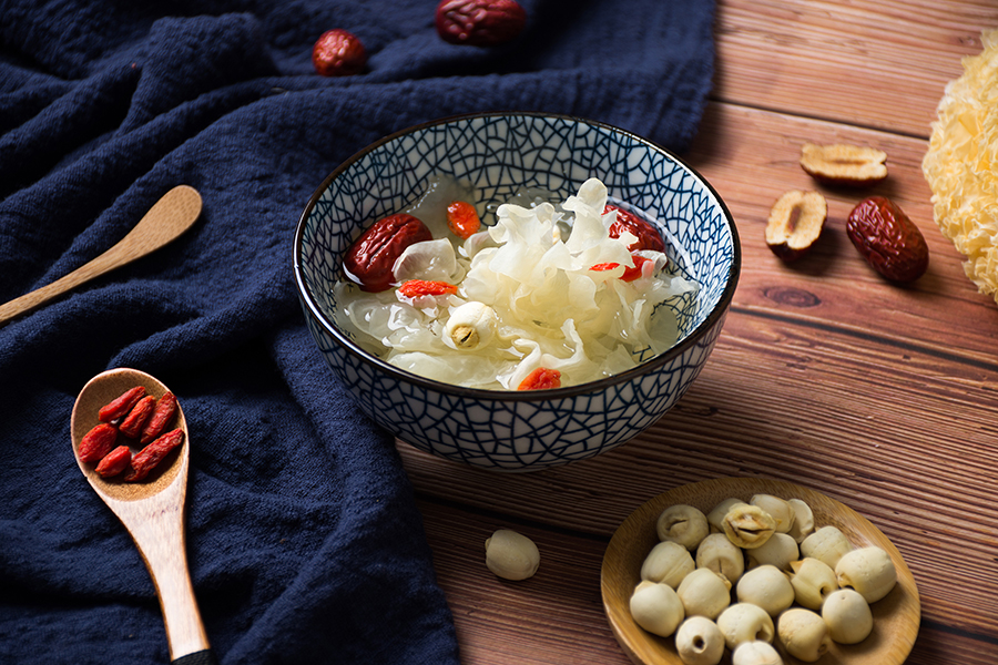 【材料】百合、莲子、山药各50克,红枣、水发银耳各30克,冰糖适量。