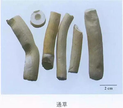 性状鉴别:本品呈圆柱形,长20~40cm,直径1~2.5cm。表面白色或淡黄色,有浅纵沟纹。体轻,质松软,稍有弹性,易折断,断面平坦,显银白色光泽,中部有直径0.3~1.5cm的空心或半透明的薄膜,纵剖面呈梯状排列,实心者少见。气微,味淡。