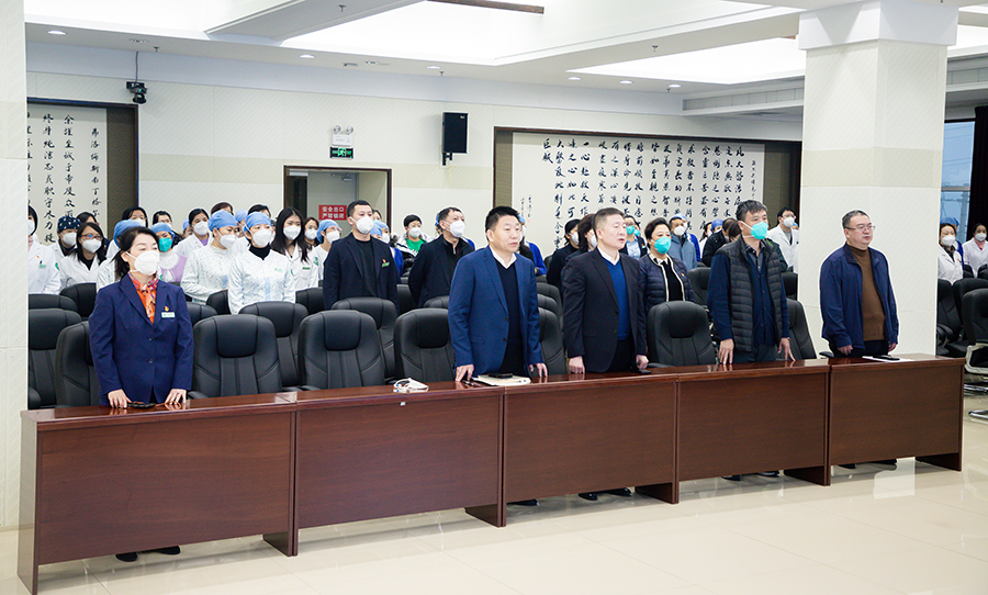 14时,大会在庄严的国歌声中拉开帷幕。首先,石贵军院长带领与会代表深切缅怀、沉痛悼念已故原副院长曲生同志,并默哀1分钟表达对去世的医务人员的哀悼。