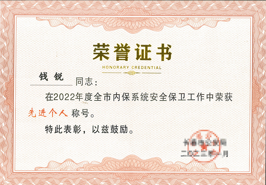 石贵军、钱锐在2022年度全市内保系统安全保卫工作中荣获先进个人称号;中文成人网