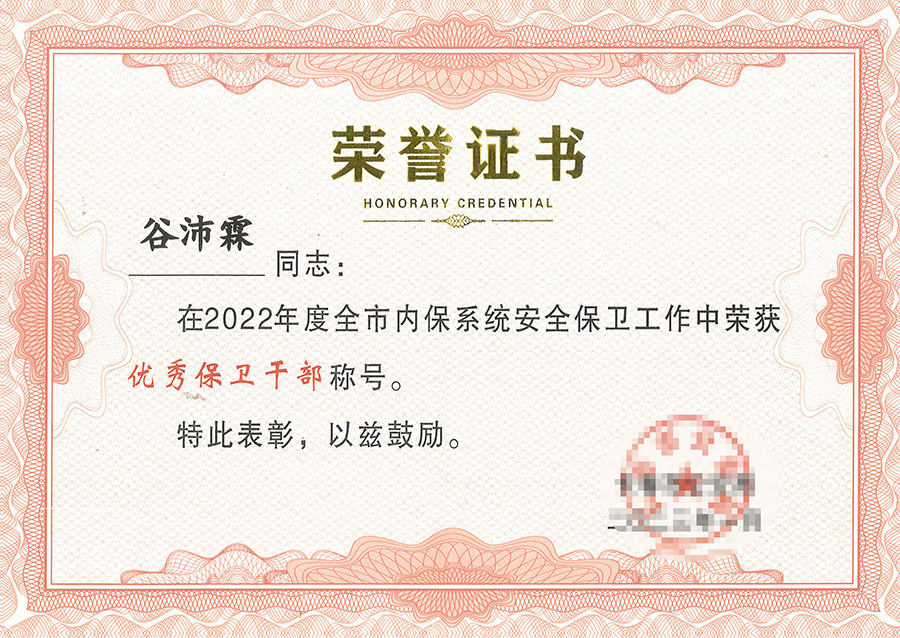 丰杰、谷沛霖在2022年度全市内保系统安全保卫工作中荣获优秀保卫干部称号。