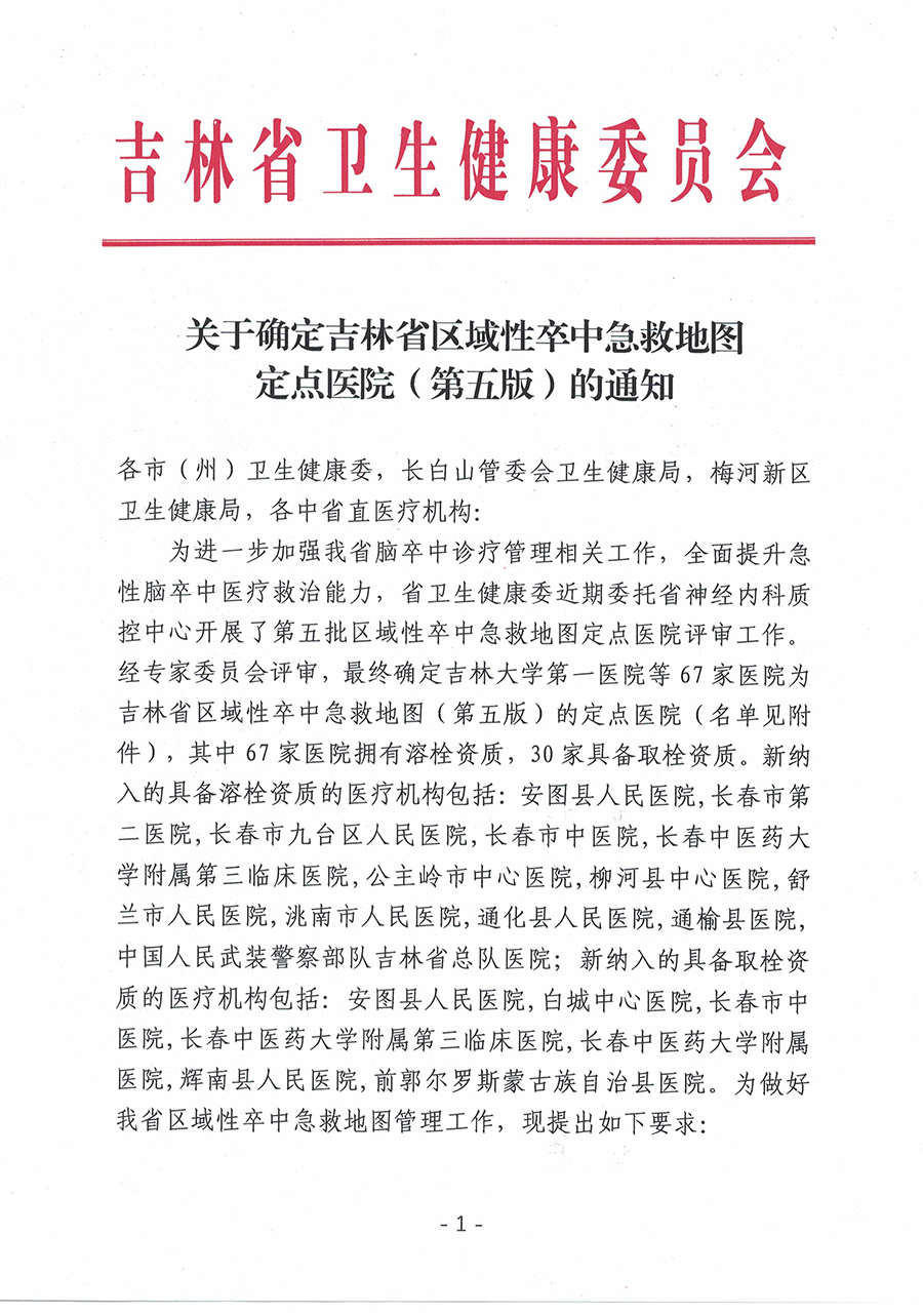 为进一步加强吉林省脑卒中诊疗管理相关工作,全面提升急性脑卒中医疗救治能力,省卫生健康委近期委托省神经内科质控中心开展了第五批区域性卒中急救地图定点医院评审工作。经专家委员会评审,拥有溶栓、取栓资质的中文成人网 ,获批成为“吉林省长春市卒中急救地图定点医院”(第五版)。