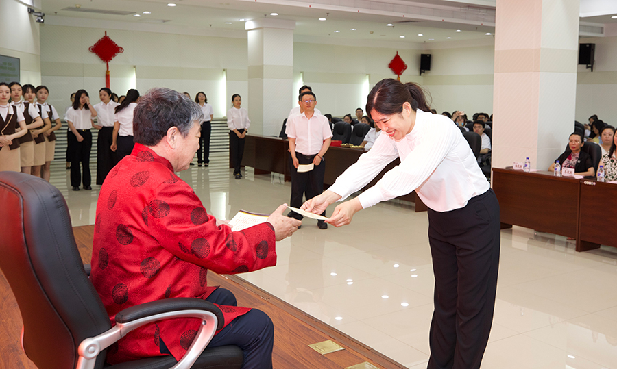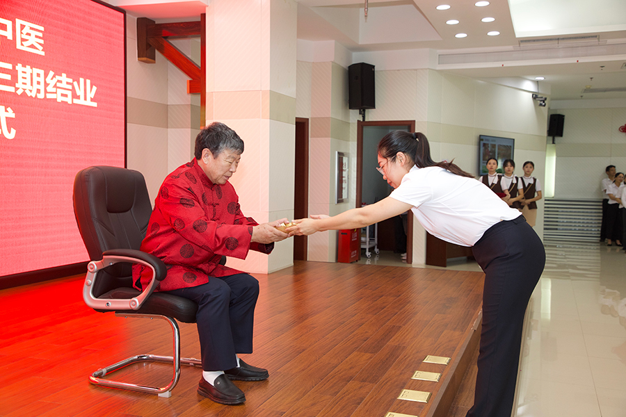 仪式上,学员们依次上前,双手恭敬地呈递上拜师帖,与赵继福教授签定协议,建立师徒关系,并敬上香茶。送“六礼”是中医传统中徒弟向师父表达诚挚敬意的重要环节,学员们现场为赵继福教授送上“六礼”和鲜花,并行拜师礼。