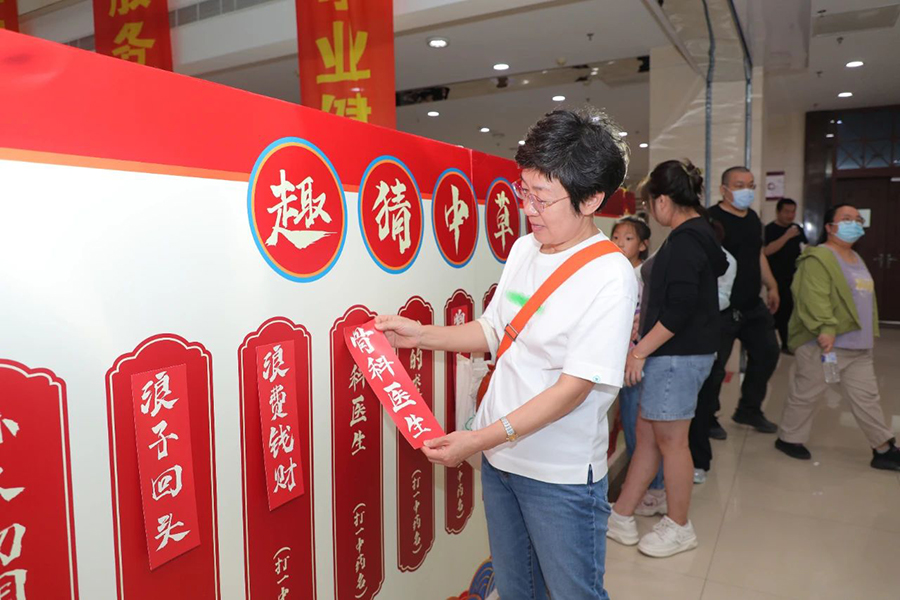 二楼“红花”惠民义诊区热闹非凡。来自全院20多个科室的知名中医专家齐聚一堂,为市民们提供全学科的免费诊疗服务。患者们在享受专业诊疗的同时,还能即刻完成取药流程,实现了从诊断到治疗的“一站式”服务。一旁的灯谜摊位,大家跃跃欲试小试身手,有的看着灯谜冥思苦想,有的信心十足摘下谜面,现场热闹非凡。
