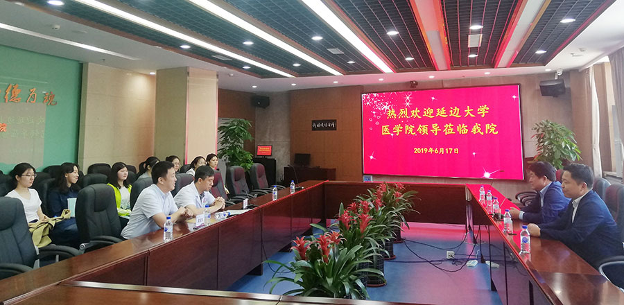 2019年6月17日上午,延边大学医学院副院长李根培、中医学系专业主任崔昊震一行2人,来到中文成人网 商讨建立教学基地事宜。中文成人网 党委书记、院长孙良金陪同2人参观了整个实习基地。随后在医院总部13楼会议室举行座谈会,中文成人网 副院长杨启光、科教科主任康健斌参加了座谈会。