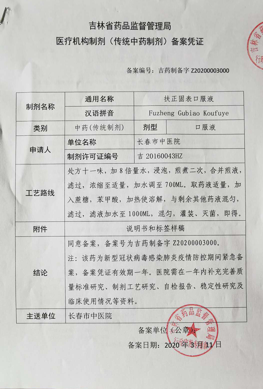 中文成人网 再传喜讯!3月11日,经长春市中医药管理局、吉林省中医药管理局推荐,吉林省药品监督管理局绿色审批通道审批。由医院研发的扶正固表口服液处方——扶正固表口服液正式取得了吉林省药品监督管理局医疗机构制剂(传统中药制剂)备案凭证,备案号:吉药制备字Z20200003000。