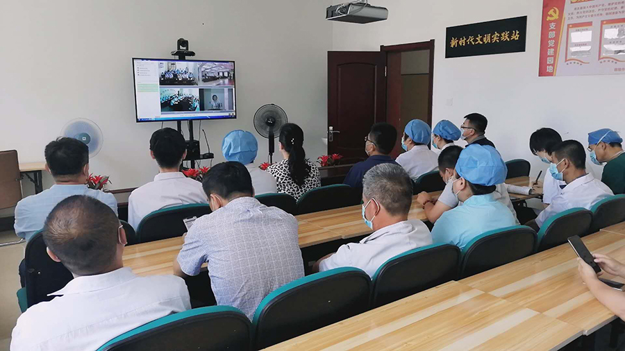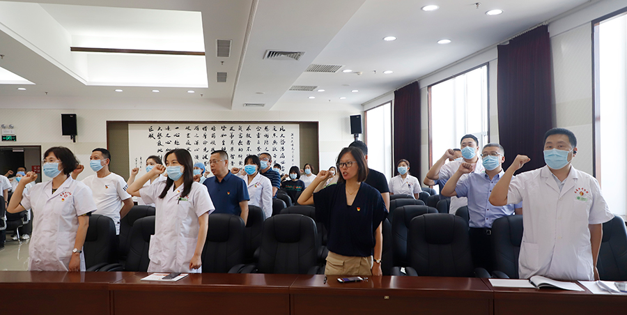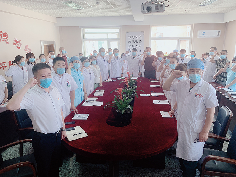 201名党员分布在医院总部主会场,医院平阳部和东部分会场。虽不在一起,但祝福同在。起立,同唱国歌。一份庄严,一份肃穆,唱出我们对祖国的赤诚之爱。
